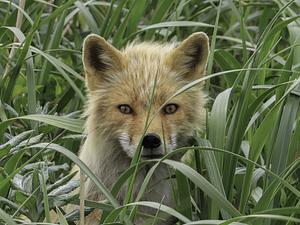 A curious fox kit peers out of the Aleutian sea grass