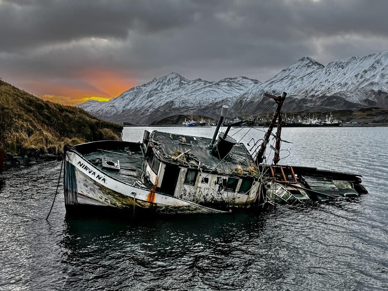 the F/V Nirvana in its resting place, under a setting sun