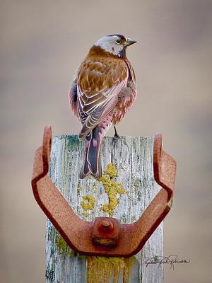 Gray Crowned Rosy Finch, a common bird in Unalaska, perches on a fencepost relic from WWII