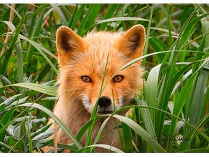 Curious Arctic Fox kit peeks from behind beach grass at Summer Bay